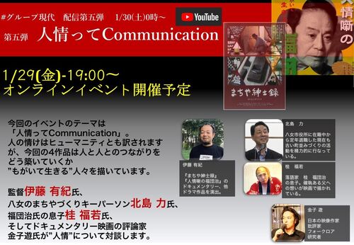 今月もグループ現代の配信番組に出演します今回もかなり賑やかになりそうですね~人情ってCommunication~ 1/29(金)19:00より、第五弾オンライン無料イベント開催 【出演者】 伊藤有紀(『まちや紳士録』『人情噺の福団治』監督) 北島力(『まちや紳士録…